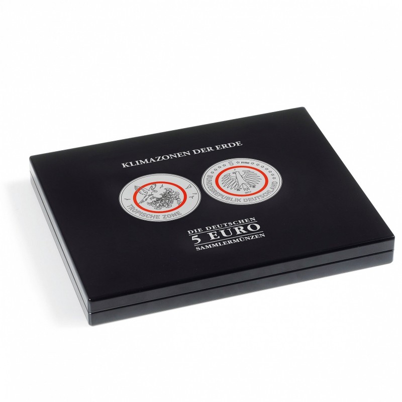 This elegant black presentation case is especially suitable for collecting all 25 German 5-euro collector coins of the series “Earth's climatic zones” (minting letters A, D, F, G, J) in capsules (inner diameter 27 mm / 1"). 1 tray featuring a black velour surface and 25 round cavities (diameter 33 mm / 1 ¼"). Elaborate “Tropical zone” coin design printing on lid and cushion (Printing on lid: multicolored, printing on cushion: monocolored). Lid cushion is up-holstered in black satin. Secure and unobtrusive magnetic lock. Overall size: 305 x 30 x 245 mm (12 x 1 ¼ x 9 ?").