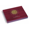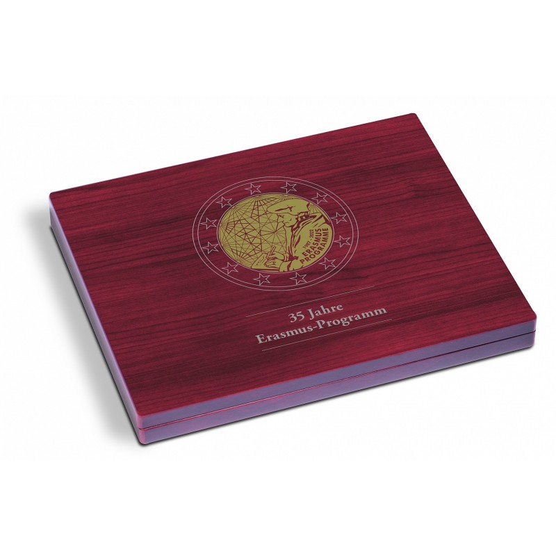 The premium, mahogany-coloured coin case serves to store all 23 2-euro coins of the collective issues 2022 „35 Years Erasmus Program“ in capsules incl. the 5 German Mints (A, D, F, G, J). One inlay with blue, velour-like surface and 23 round cavities for inserting the capsuled coins. Noble, theme specific lid and cushion print as well as inscription of the inlay with country markings. Unobtrusive magnetic closure. Outer Format: 305 x 30 x 245 mm.