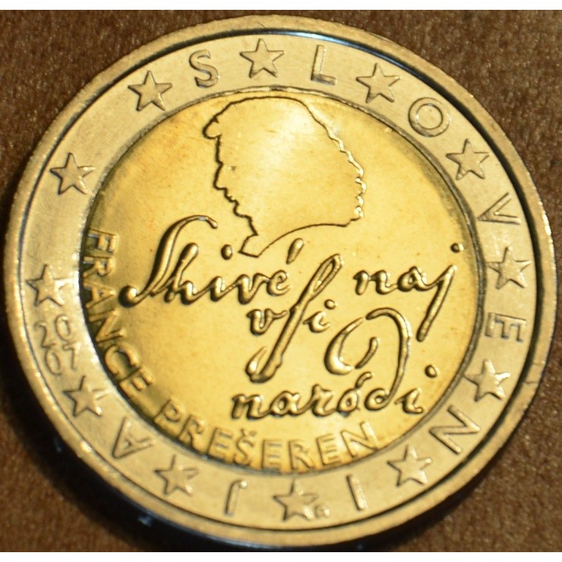 Na 2 Eurovej minci dominuje básnik France Preseren a nadpis 'Shivé naj vsi naródi' (Boh žehnaj celému národu), čo je citát z národnej hymny Slovinska.